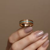 With a vibrant blue line of crushed turquoise balanced perfectly on either side by coastal red alder and gleaming yellow gold inlays, this 6mm-wide Dakota ring captures the essence of the coast. Its three equally spaced inlays reflect the tranquil beauty of the seaside. The red alder wood, with its warm, honey-toned character, exudes a beachy charm, creating a sense of harmony and balance. This natural grace effortlessly complements the vivid blue crushed turquoise inlay, a captivating representation of the ocean's splendor.