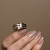 Using a special blend of grain we can achieve a bright white gold that doesn’t need to be replated and will never lose its brilliance. With the inlay of wood protected from water with a glass-like finish, this ring is perfect for the low-maintenance wearer that still wants a uniquely special band.