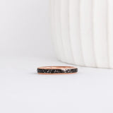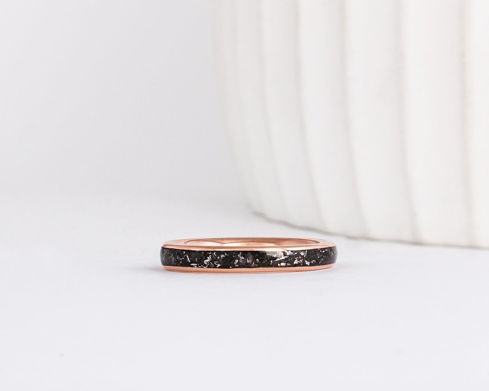 This beautiful rose gold ring features a rounded profile and a comfort fit band that makes it a pleasure to wear. The 3mm width pairs perfectly with our signature solitaire, while the meteorite inlay adds a bold, distinctive contrast and a touch of cosmic character. Best of all, our rose gold’s natural hue doesn’t fade over time, so you can enjoy its warm, enduring beauty for years to come.