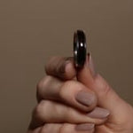 A rounded white gold band encases a full width inlay of dark black ebony wood made in the bentwood style, with 1mm gold borders on either edge.